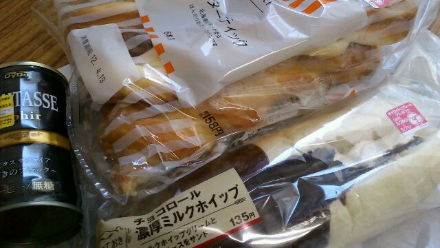 今日の朝ごはんはバタースティックとチョコロール濃厚ホイップロールでした。