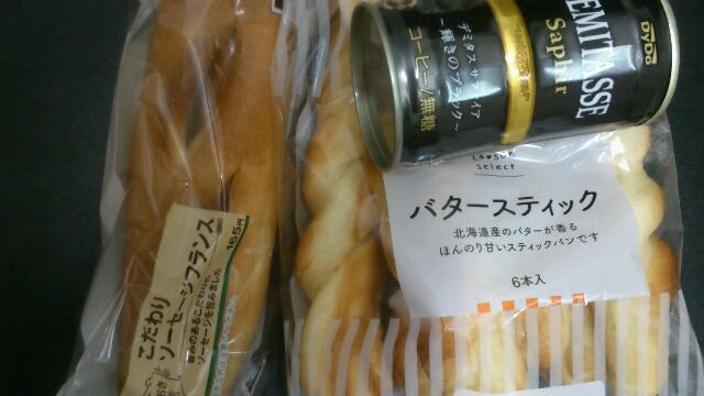 今日の朝ごはんはおにぎり1つとバタースティックとこだわりソーセージフランスです。