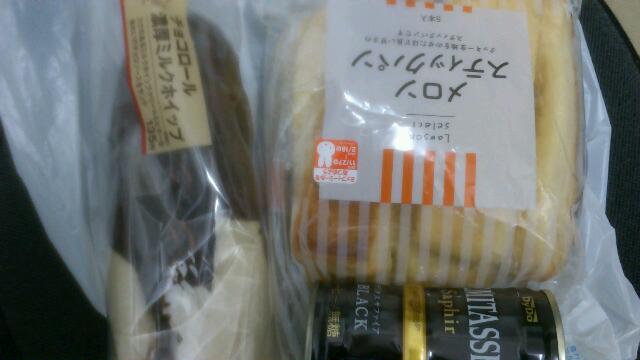 今日の朝ごはんはおにぎり1つとチョコロール濃厚ミルクホイップとメロンスティックパンです。