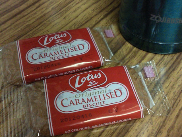 今日の晩おやつは、ロータスカラメルビスケット2つ。