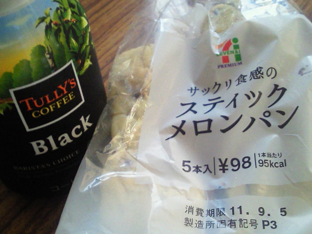 今日の朝ご飯は、スティックメロンパンとタリーズコーヒーのブラックです。