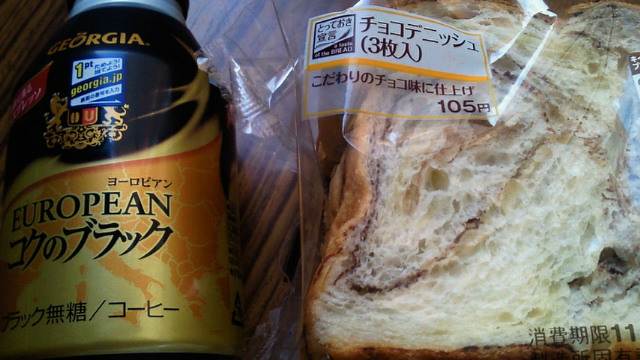 というわけで朝ご飯、チョコデニッシュとジョージアEUROPEANコクのブラックです。