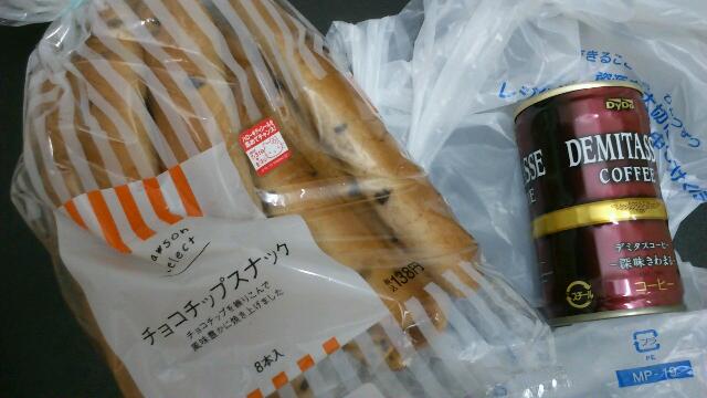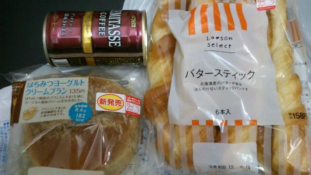 今日の朝ごはんは、バタースティックとカフェモカロールとおにぎり1つでした。