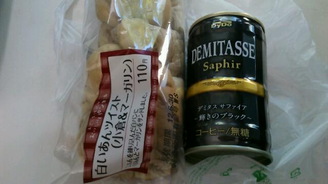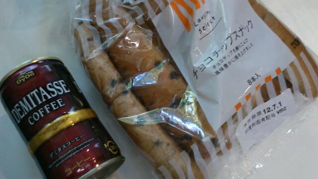 今日の朝ごはんはチョコチップスナックとおにぎり1つでした。コーヒーはデミタスコーヒー、キャッスルホテルのローソンはデミタスブラックを置いていないのが残念です。