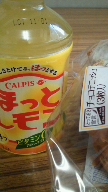 今日の晩おやつは、チョコデニッシュとほっとレモンです。